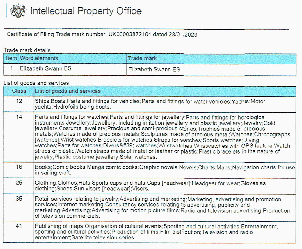 http://innerspacecoadventurestormjohnfranchise.com/IP/TradeMarks_Elizabeth_Swann_Registered_Applications_Ships_Comics_IPO_Films_Education_Sporting_UK3872104_Events_Publishing_Intellectual_Property.html